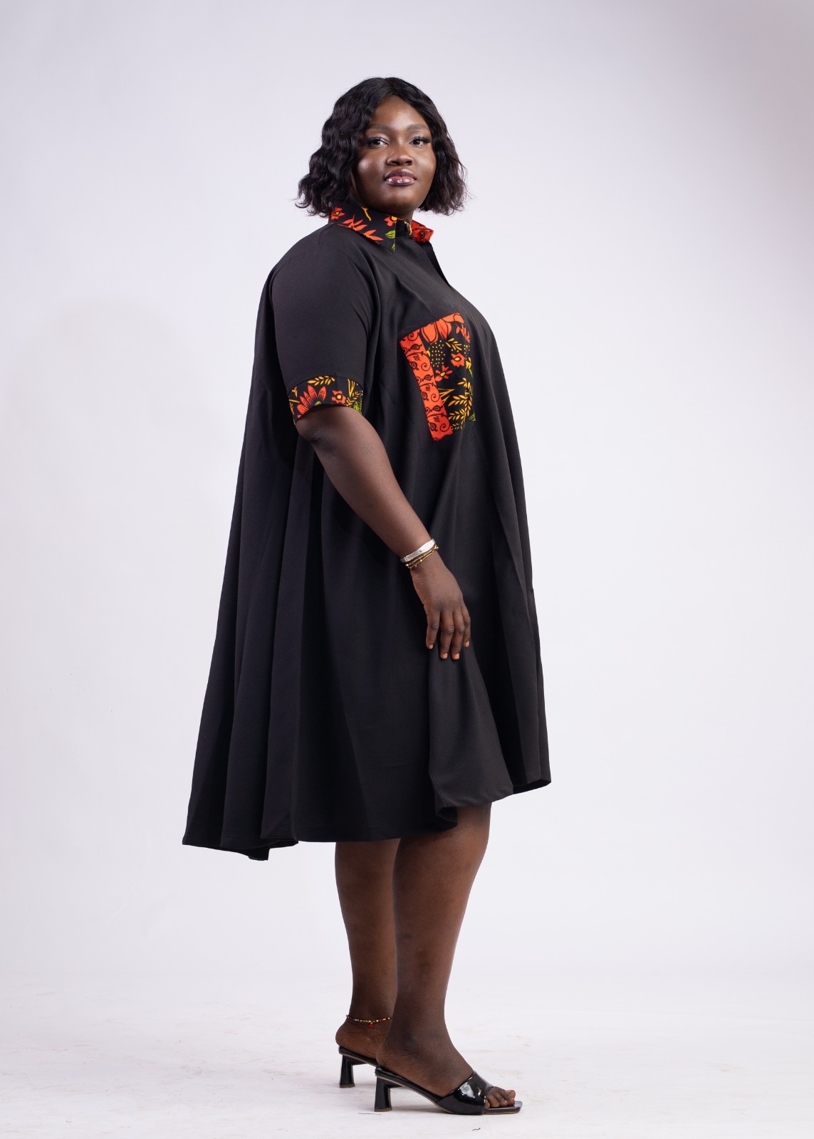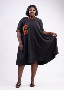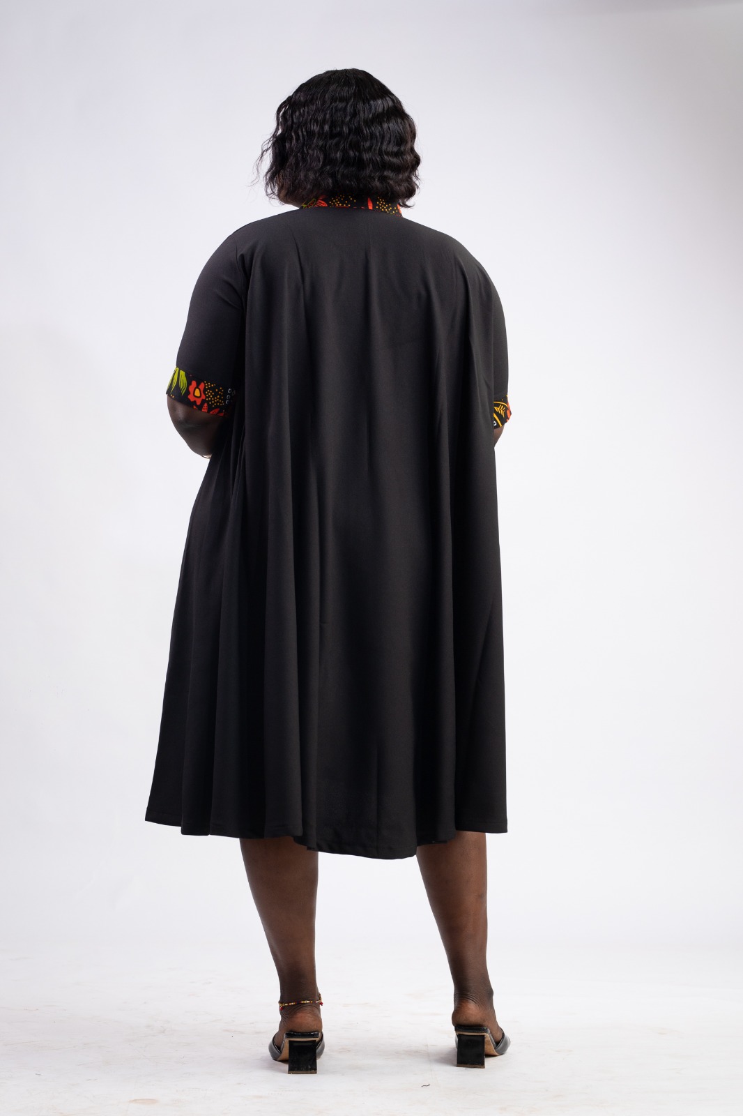 Robe évasée 3/4 en tissus noir et wax