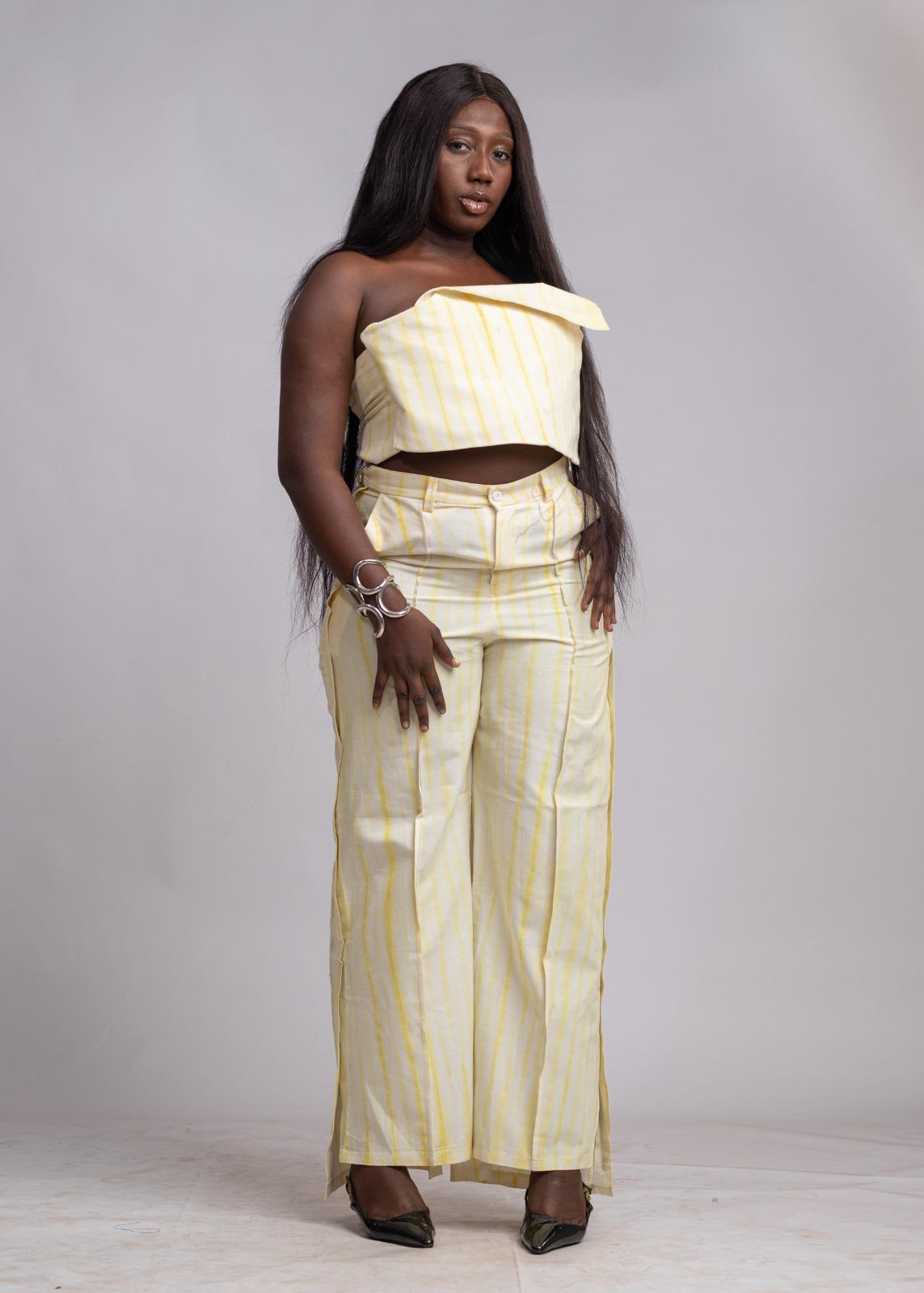 Cet ensemble chic combine un haut bustier élégant et un pantalon fluide, le tout dans des teintes vibrantes de jaune et blanc. Parfait pour les occasions estivales, il offre un look frais et tendance. Confortable et stylé, c’est un incontournable pour celles qui veulent se démarquer avec aisance.