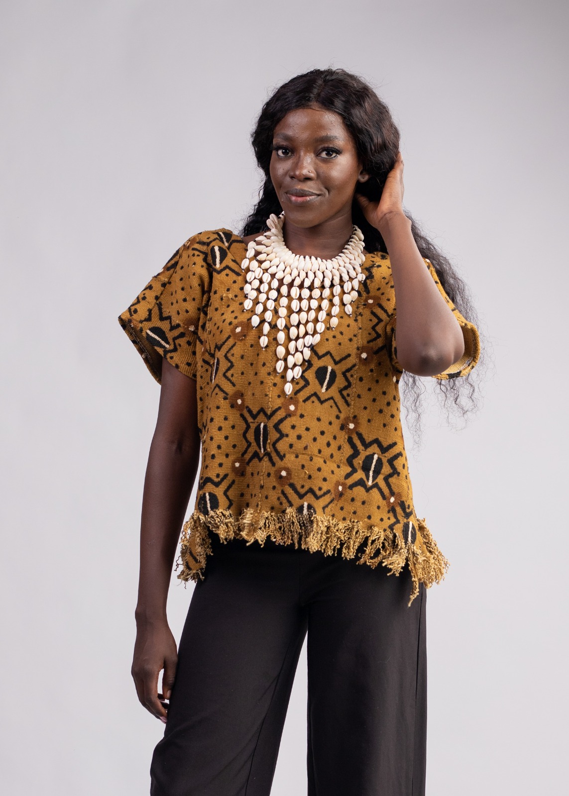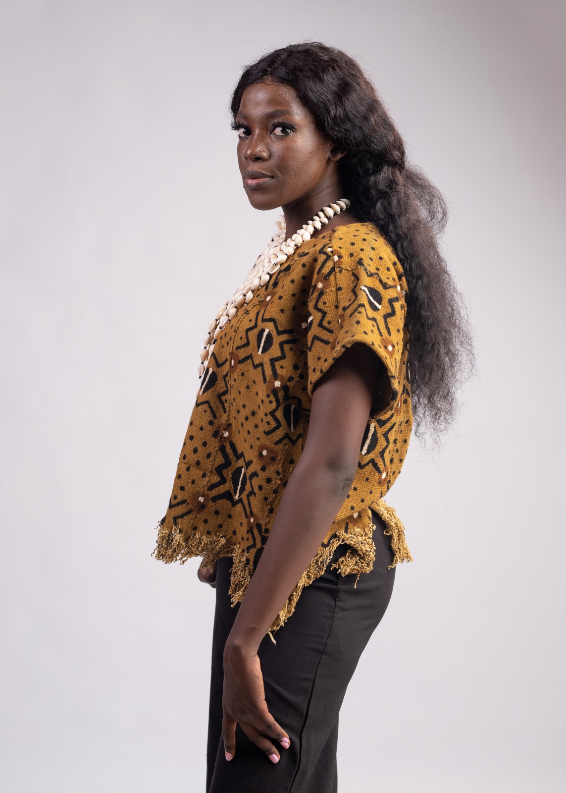 Ce petit haut pour femme en bogolan se distingue par son motif traditionnel marron et noir. Fabriqué à partir de tissus naturels 10% coton, il offre un look à la fois chic et décontracté. Léger et respirant, il est parfait pour les journées ensoleillées ou les sorties entre amis(es).