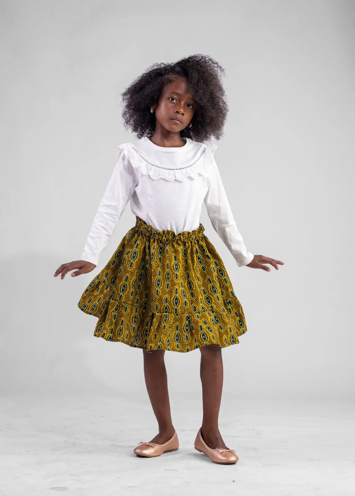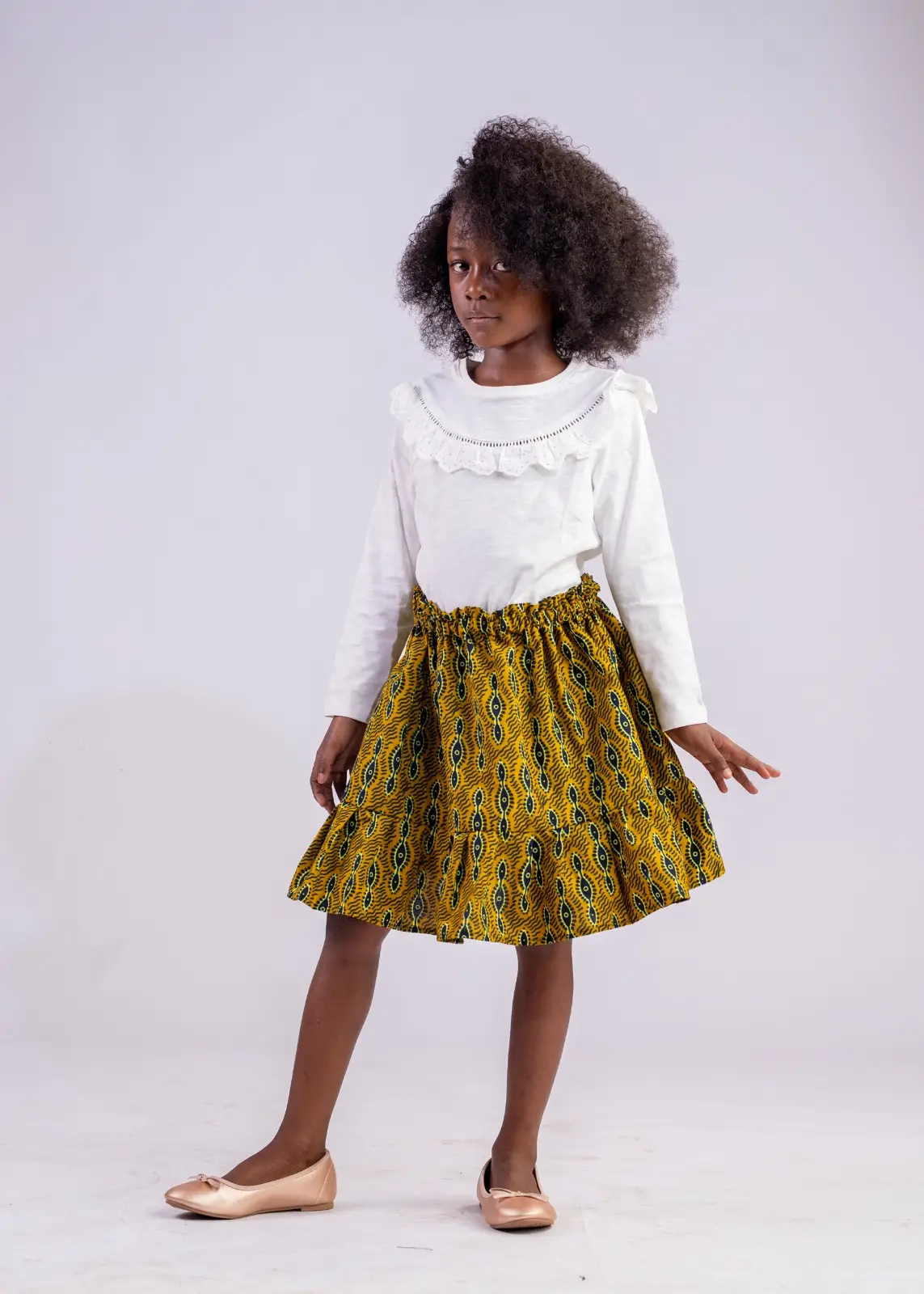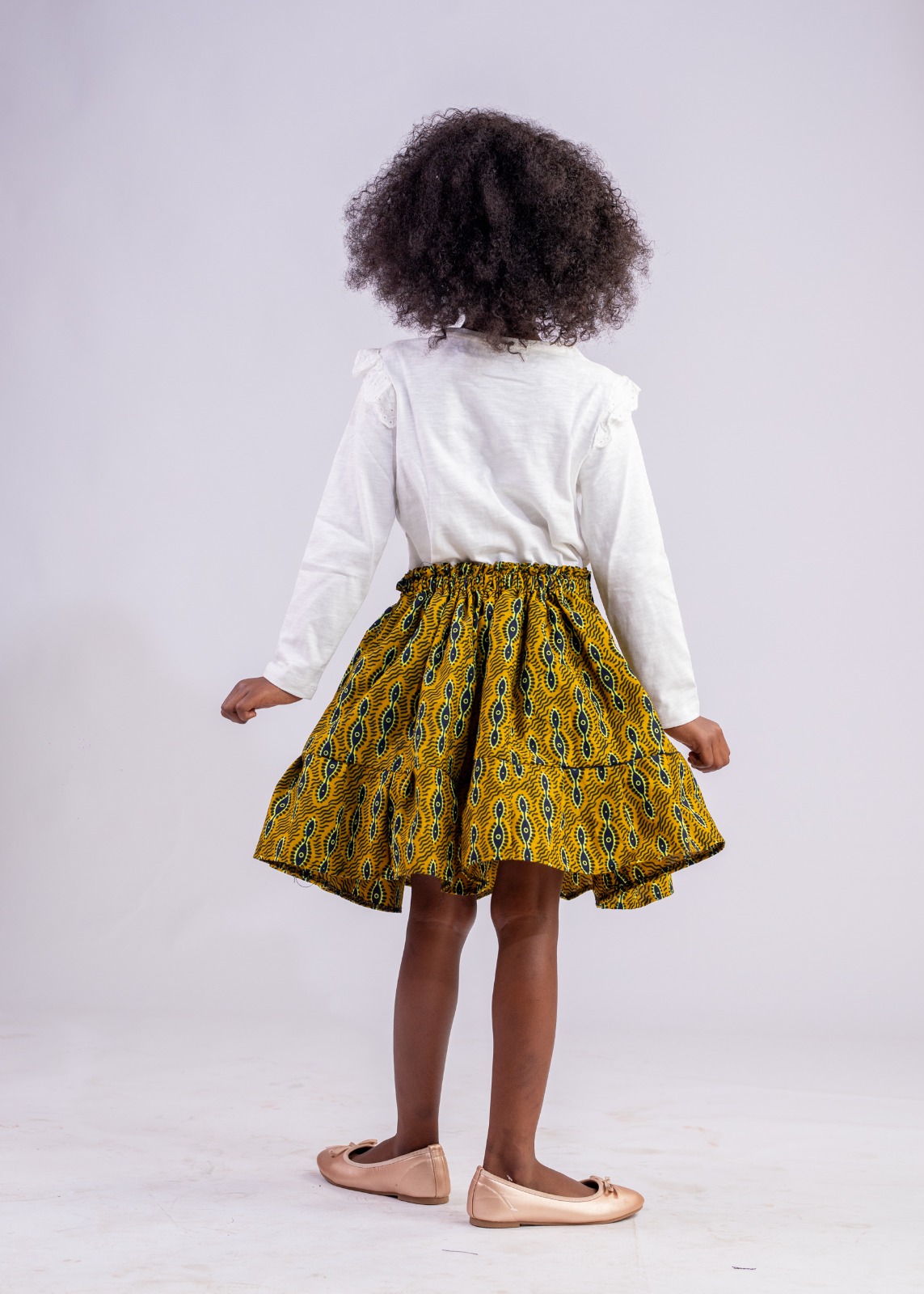 Cette adorable jupe en wax verte est parfaite pour apporter une touche de couleur et d’originalité à la garde-robe des petites filles. Confectionnée dans un tissu léger et résistant, elle offre confort et liberté de mouvement.